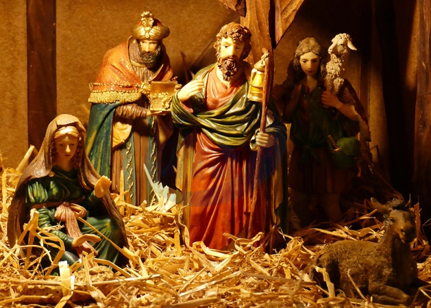 A traditional nativity scene in St. Andrews Church. The traditional nativity story tells of Mary and Joseph traveling to Bethlehem for a Roman census, where no room was available at the inn, so Jesus was born in a stable and laid in a manger. Shepherds, guided by angels, and later, Wise Men (Magi) following a star, visited the baby, bringing gifts like gold, frankincense, and myrrh, while Joseph was warned in dreams to flee to Egypt to escape King Herod's jealousy. The traditional nativity scene's history begins with St. Francis of Assisi staging the first living nativity in Greccio, Italy, in 1223, using real people and animals to convey the humility of Christ's birth, a practice that spread quickly. It evolved from live enactments to static displays with figures, Credit:Geoffrey Swaine / Avalon