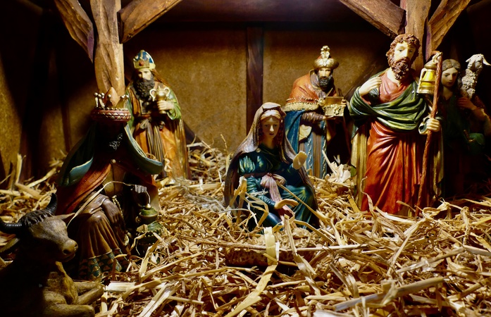 A traditional nativity scene in St. Andrews Church. The traditional nativity story tells of Mary and Joseph traveling to Bethlehem for a Roman census, where no room was available at the inn, so Jesus was born in a stable and laid in a manger. Shepherds, guided by angels, and later, Wise Men (Magi) following a star, visited the baby, bringing gifts like gold, frankincense, and myrrh, while Joseph was warned in dreams to flee to Egypt to escape King Herod's jealousy. The traditional nativity scene's history begins with St. Francis of Assisi staging the first living nativity in Greccio, Italy, in 1223, using real people and animals to convey the humility of Christ's birth, a practice that spread quickly. It evolved from live enactments to static displays with figures, Credit:Geoffrey Swaine / Avalon