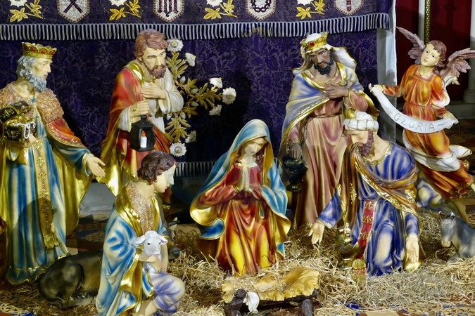 A traditional nativity scene in St. Andrews Church. The traditional nativity story tells of Mary and Joseph traveling to Bethlehem for a Roman census, where no room was available at the inn, so Jesus was born in a stable and laid in a manger. Shepherds, guided by angels, and later, Wise Men (Magi) following a star, visited the baby, bringing gifts like gold, frankincense, and myrrh, while Joseph was warned in dreams to flee to Egypt to escape King Herod's jealousy. The traditional nativity scene's history begins with St. Francis of Assisi staging the first living nativity in Greccio, Italy, in 1223, using real people and animals to convey the humility of Christ's birth, a practice that spread quickly. It evolved from live enactments to static displays with figures, Credit:Geoffrey Swaine / Avalon