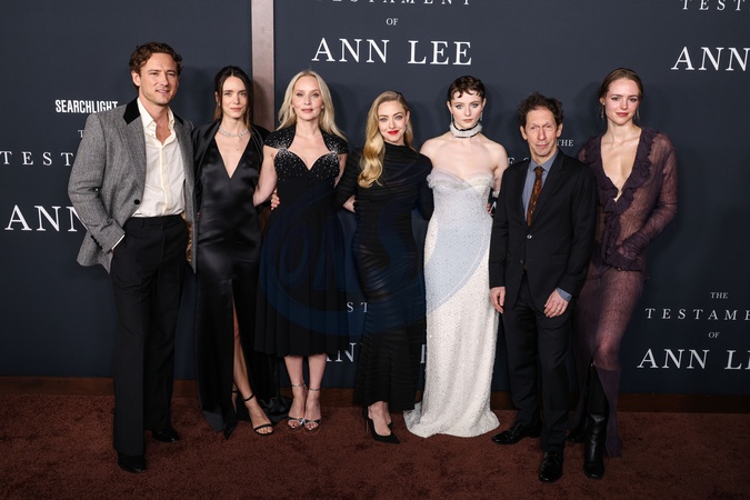 HOLLYWOOD, LOS ANGELES, CALIFORNIA, USA - DECEMBER 14: American actor Lewis Pullman, French actress Stacy Martin, Norwegian filmmaker and actress Mona Fastvold wearing Prada, American actress Amanda Seyfried wearing Giorgio Armani, New Zealand actress Thomasin McKenzie wearing Rodarte FW25 RTW, American actor, writer, director, and producer Tim Blake Nelson and American actress and director Natalie Shinnick arrive at the Los Angeles Premiere Of Searchlight Pictures' 'The Testament Of Ann Lee' held at the Academy of Motion Picture Arts and Sciences - Linwood Dunn Theater on December 14, 2025 in Hollywood, Los Angeles, California, United States., Credit:Xavier Collin / Avalon
