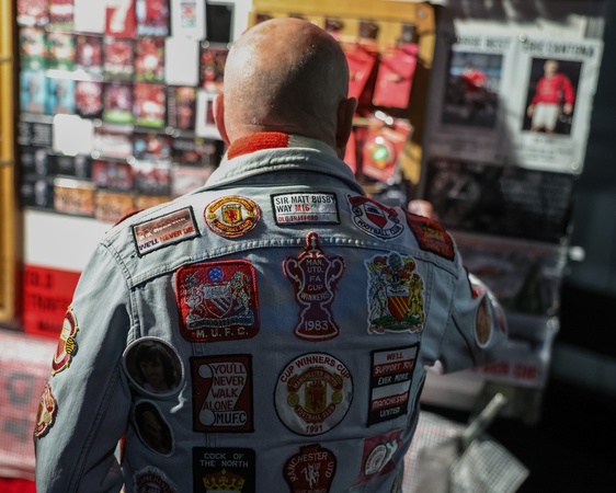 A Manchester United fan looks for memorabilia patches to purchase for his denim jacket during the Premier League match Manchester United vs Bournemouth at Old Trafford, Manchester, United Kingdom, 15th December 2025, Credit:Mark Cosgrove/News Images / Avalon
