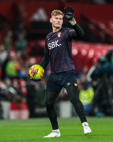 Bournemouth goalkeeper Callan McKenna in the pregame warmup session during the Premier League match Manchester United vs Bournemouth at Old Trafford, Manchester, United Kingdom, 15th December 2025, Credit:Mark Cosgrove/News Images / Avalon