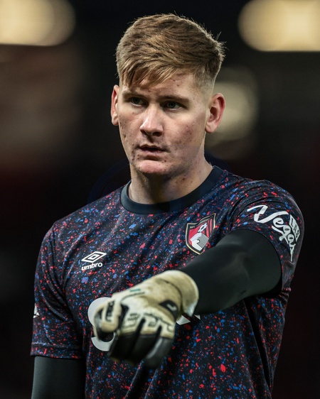 Bournemouth goalkeeper Callan McKenna in the pregame warmup session during the Premier League match Manchester United vs Bournemouth at Old Trafford, Manchester, United Kingdom, 15th December 2025, Credit:Mark Cosgrove/News Images / Avalon
