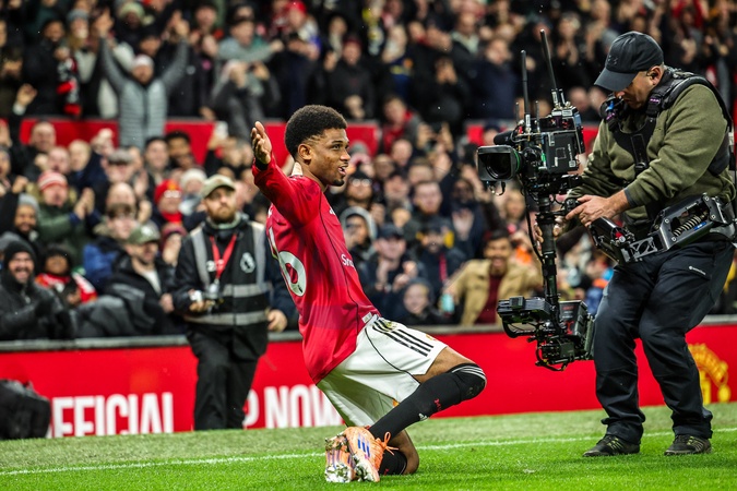 Amad Diallo of Manchester Untied celebrates his goal to make it 1-0 during the Premier League match Manchester United vs Bournemouth at Old Trafford, Manchester, United Kingdom, 15th December 2025, Credit:Mark Cosgrove/News Images / Avalon