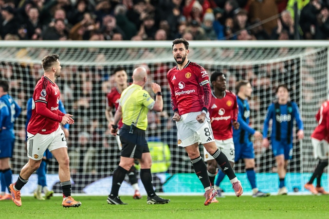 Bruno Fernandes of Manchester Untied celebrates his goal to make it 3-3 during the Premier League match Manchester United vs Bournemouth at Old Trafford, Manchester, United Kingdom, 15th December 2025, Credit:Mark Cosgrove/News Images / Avalon