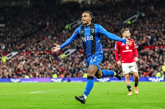 Eli Junior Kroupi of Bournemouth celebrates his goal to make it 4-4 during the Premier League match Manchester United vs Bournemouth at Old Trafford, Manchester, United Kingdom, 15th December 2025, Credit:Mark Cosgrove/News Images / Avalon
