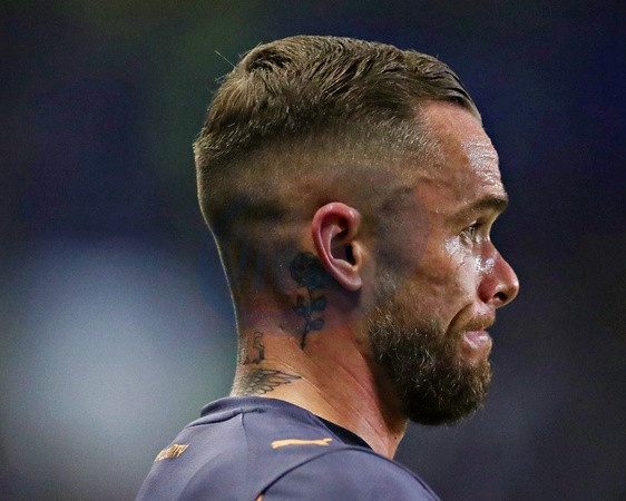 A tattoo on the neck of Joe Ward of Derby County during the Sky Bet Championship match Sheffield Wednesday vs Derby County at Hillsborough, Sheffield, United Kingdom, 15th December 2025, Credit:Sam Eaden/News Images / Avalon