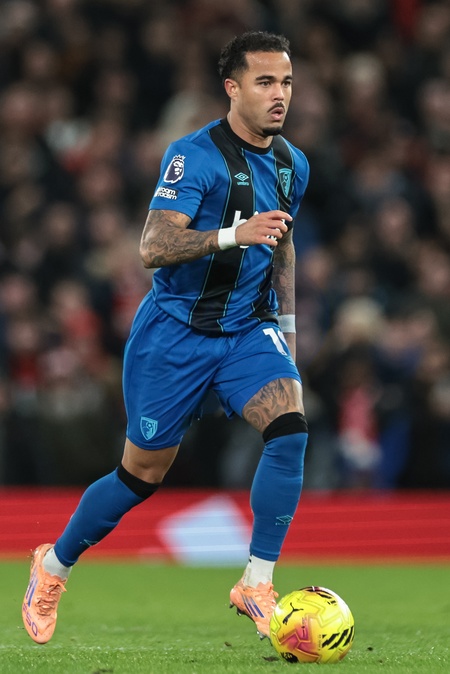 Justin Kluivert of Bournemouth breaks with the ball during the Premier League match Manchester United vs Bournemouth at Old Trafford, Manchester, United Kingdom, 15th December 2025, Credit:Mark Cosgrove/News Images / Avalon