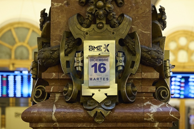 A calendar with the date at the Palacio de la Bolsa de Madrid, on December 16, 2025, in Madrid (Spain). The Ibex 35 started today's session with a fall of 0.23%, which allows it to remain above the psychological level of 17,000 points, standing at 17,002.4 at around 9:00 am. Minutes after the start of the session, the main Spanish market indicator changed course and set a new all-time high at 17,062.7 points, after advancing 0.13%.DECEMBER 16;2025 12/16/2025, Credit:Jesús Hellín / Avalon