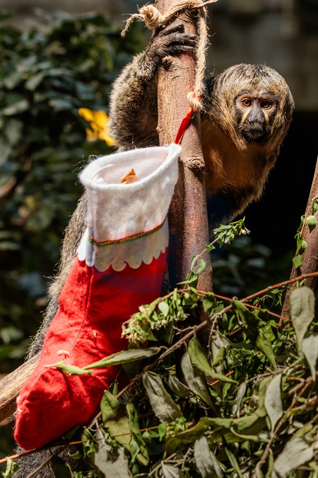 ZSL London Zoo, Regent's Park, London, UK. 16th December 2025. ZSL London Zoo's Saki Monkeys check their festive stockings for treats, gifted by zookeepers, in their Rainforest habitat, as the conservation zoo celebrates its Magic of Christmas event, Credit:Photo by Amanda Rose / Avalon