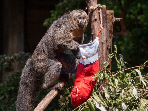 Saki monkeys with christmas stockings filled with festive treats, as the conservation zoo celebrates its Magic of Christmas event, at ZSL London Zoo in London, England. UK. Tuesday 16th December 2025, Credit:James Warren / Avalon