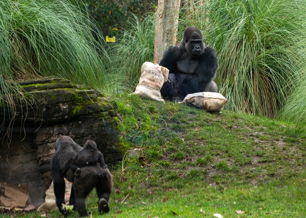 Gorillas with sacks filled with festive treats as the conservation zoo celebrates its Magic of Christmas event, at ZSL London Zoo in London, England. UK. Tuesday 16th December 2025, Credit:James Warren / Avalon