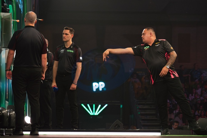 Paolo Nebrida in action during day five of the 2025/26 Paddy Power World Darts Championship at Alexandra Palace LONDON, ENGLAND on 15th DECEMBER 2025., Credit:Oleksii Ovcharenko / Avalon