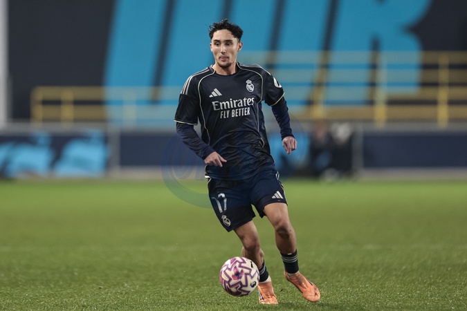 Jesus Fortea of Real Madrid with the ball during the Premier League International Cup match Manchester City vs Real Madrid at Joie Stadium, Manchester, United Kingdom, 16th December 2025, Credit:Mark Cosgrove/News Images / Avalon
