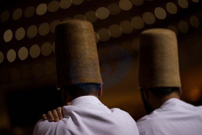 12/16/2025, Konya. Dancers wearing felt headdresses. During the week marking the 752nd anniversary of the death of the mystic Mevlana Celaleddin Rumi, musicians and semazen (whirling dervishes) performed at the Mevlana Kultur Merkezi in Konya., Credit:Valeria Ferraro / Avalon