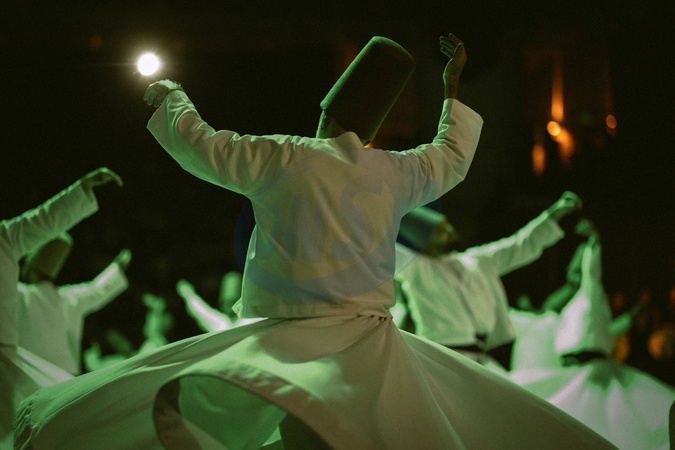 12/16/2025, Konya. Dancers wearing felt headdresses. During the week marking the 752nd anniversary of the death of the mystic Mevlana Celaleddin Rumi, musicians and semazen (whirling dervishes) performed at the Mevlana Kultur Merkezi in Konya., Credit:Valeria Ferraro / Avalon