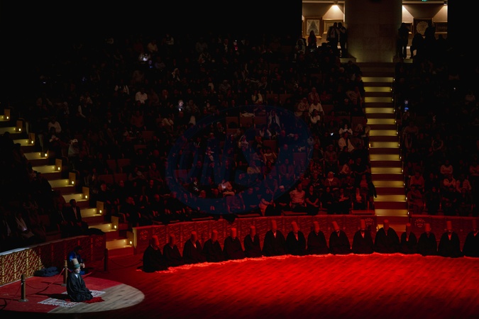 December 16, 2025, Konya. The Sheikh sitting on the red skin. During the week marking the 752nd anniversary of the death of the mystic Mevlana Celaleddin Rumi, musicians and semazen (whirling dervishes) performed a performance at the Mevlana Kultur Merkezi in Konya., Credit:Valeria Ferraro / Avalon