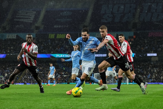 Rayan Cherki of Manchester City and Kristoffer Ajer of Brentford battle for the ball during the Carabao Cup Quarter Final match Manchester City vs Brentford at Etihad Stadium, Manchester, United Kingdom, 17th December 2025, Credit:Mark Cosgrove/News Images / Avalon