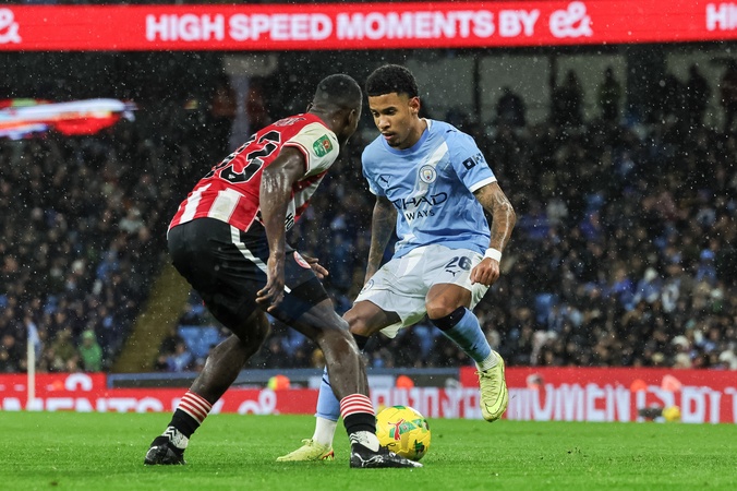 Savinho of Manchester City holds the ball during the Carabao Cup Quarter Final match Manchester City vs Brentford at Etihad Stadium, Manchester, United Kingdom, 17th December 2025, Credit:Mark Cosgrove/News Images / Avalon