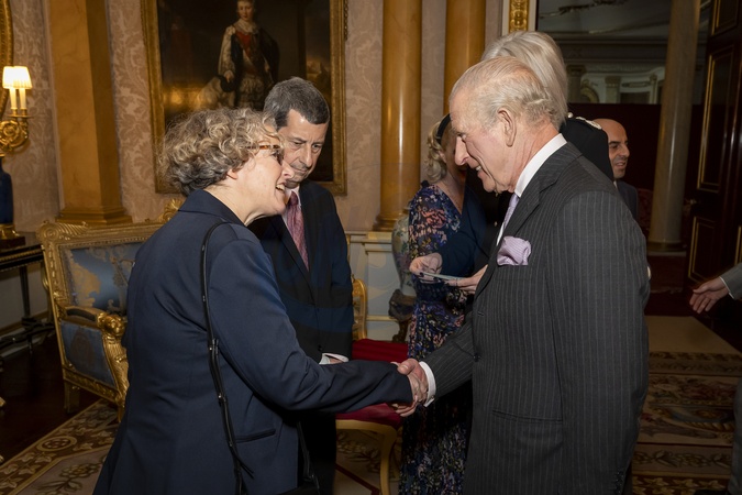 King Charles III (right) greets Kevin Deeley and wife Christie Deeley during a reception at Buckingham Palace in London for members of the public and railway staff who showed particular bravery in response to the attack in Huntingdon in Cambridgeshire. Picture date: Wednesday December 17, 2025., Credit:Aaron Chown / Avalon