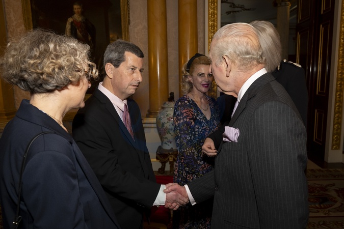 King Charles III (right) greets Kevin Deeley and wife Christie Deeley during a reception at Buckingham Palace in London for members of the public and railway staff who showed particular bravery in response to the attack in Huntingdon in Cambridgeshire. Picture date: Wednesday December 17, 2025., Credit:Aaron Chown / Avalon