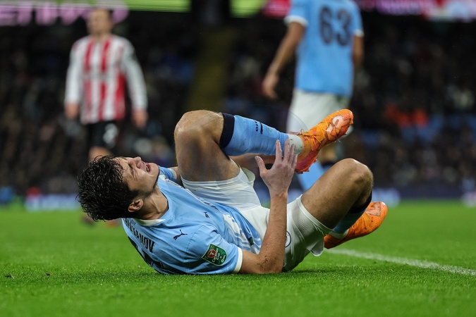Abdukodir Khusanov of Manchester City takes a knock during the Carabao Cup Quarter Final match Manchester City vs Brentford at Etihad Stadium, Manchester, United Kingdom, 17th December 2025, Credit:Mark Cosgrove/News Images / Avalon