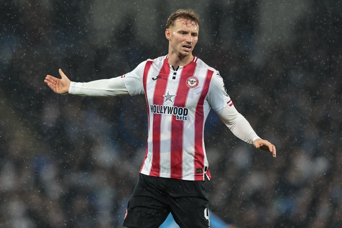 Sepp van den Berg of Brentford races during the Carabao Cup Quarter Final match Manchester City vs Brentford at Etihad Stadium, Manchester, United Kingdom, 17th December 2025, Credit:Mark Cosgrove/News Images / Avalon
