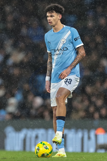 Nico O'Reilly of Manchester City with the ball during the Carabao Cup Quarter Final match Manchester City vs Brentford at Etihad Stadium, Manchester, United Kingdom, 17th December 2025, Credit:Mark Cosgrove/News Images / Avalon