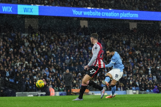 Rayan Cherki of Manchester City shoots on goal during the Carabao Cup Quarter Final match Manchester City vs Brentford at Etihad Stadium, Manchester, United Kingdom, 17th December 2025, Credit:Mark Cosgrove/News Images / Avalon