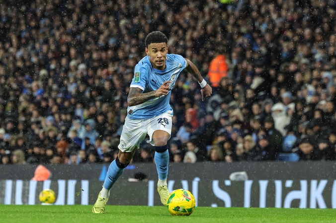 Savinho of Manchester City breaks with the ball during the Carabao Cup Quarter Final match Manchester City vs Brentford at Etihad Stadium, Manchester, United Kingdom, 17th December 2025, Credit:Mark Cosgrove/News Images / Avalon