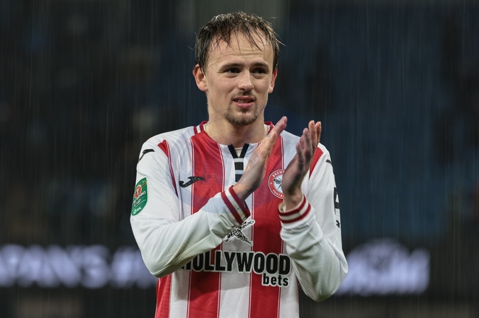 Mikkel Damsgaard of Brentford applauds the fans after the final whistle during the Carabao Cup Quarter Final match Manchester City vs Brentford at Etihad Stadium, Manchester, United Kingdom, 17th December 2025, Credit:Mark Cosgrove/News Images / Avalon
