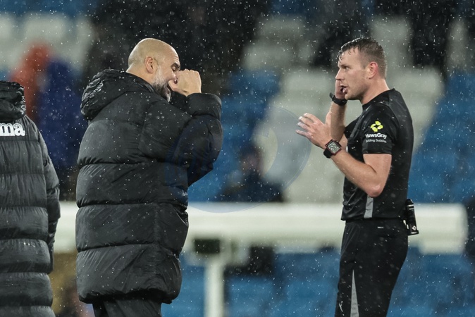 Pep Guardiola manager of Manchester City speaks out Referee Sam Barrott during the Carabao Cup Quarter Final match Manchester City vs Brentford at Etihad Stadium, Manchester, United Kingdom, 17th December 2025, Credit:Mark Cosgrove/News Images / Avalon