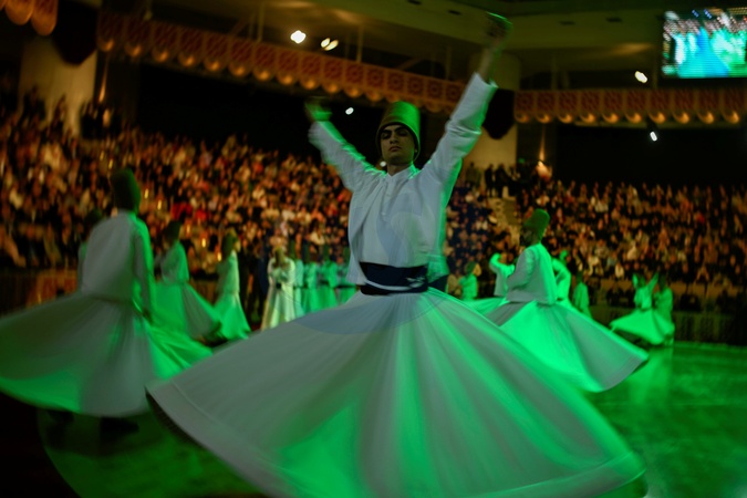 A moment from the sema ceremony commemorating Rumi's death. The 752nd anniversary of the death of the mystic Mevlana Celaleddin Rumi concluded with numerous visitors to the museum-mausoleum and the sema, the dance of the whirling dervishes, at the Mevlana Kultur Merkezi. Konya, Turkiye 17 December 2025, Credit:Valeria Ferraro / Avalon