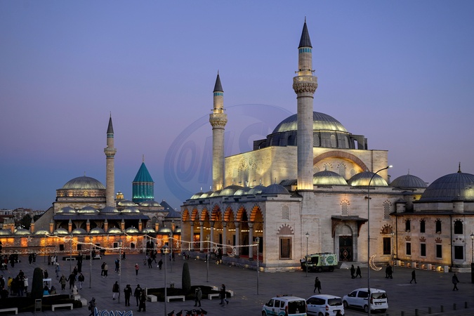 The 752nd anniversary of the death of the mystic Mevlana Celaleddin Rumi concluded with numerous visitors to the museum-mausoleum and the sema, the dance of the whirling dervishes, at the Mevlana Kultur Merkezi. Pictured is the Mevlana Mausoleum-Museum, with the Green Dome and the Selimiye Mosque. Konya, Turkiye 17 December 2025, Credit:Valeria Ferraro / Avalon