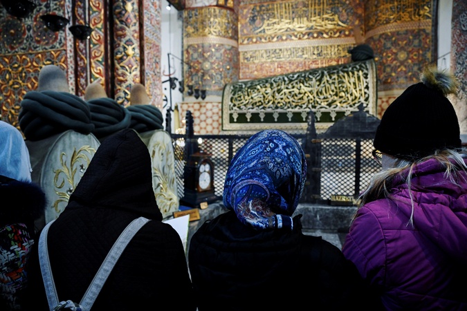 The 752nd anniversary of the death of the mystic Mevlana Celaleddin Rumi concluded with numerous visitors to the museum-mausoleum and the sema, the dance of the whirling dervishes, at the Mevlana Kultur Merkezi. Pictured: Women praying before Mevlana's tomb. Konya, Turkiye 17 December 2025, Credit:Valeria Ferraro / Avalon