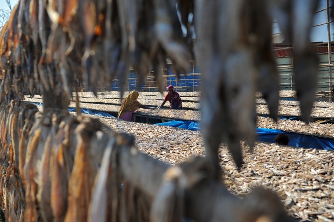 Chattogram, Bangladesh- Workers process fish at an open drying yard in Chattogram, Bangladesh. The fish are cleaned, salted, and sun-dried on bamboo platforms for four to seven days, depending on weather conditions. Dry fish processing requires consistent heat and remains a vital food source in Bangladesh, accounting for the fourth-largest share of fish consumption and providing an affordable protein across all income levels. The dried fish are distributed for domestic use and export., Credit:Md Rafayat Haque Khan / Avalon