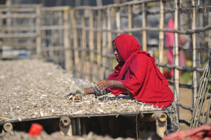 Chattogram, Bangladesh- Workers process fish at an open drying yard in Chattogram, Bangladesh. The fish are cleaned, salted, and sun-dried on bamboo platforms for four to seven days, depending on weather conditions. Dry fish processing requires consistent heat and remains a vital food source in Bangladesh, accounting for the fourth-largest share of fish consumption and providing an affordable protein across all income levels. The dried fish are distributed for domestic use and export., Credit:Md Rafayat Haque Khan / Avalon