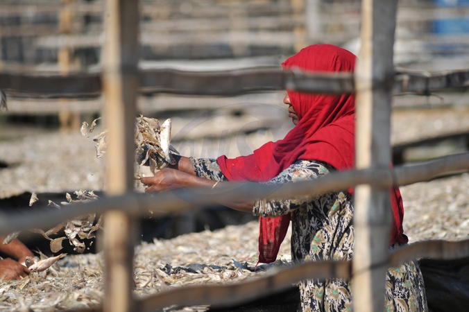 Chattogram, Bangladesh- Workers process fish at an open drying yard in Chattogram, Bangladesh. The fish are cleaned, salted, and sun-dried on bamboo platforms for four to seven days, depending on weather conditions. Dry fish processing requires consistent heat and remains a vital food source in Bangladesh, accounting for the fourth-largest share of fish consumption and providing an affordable protein across all income levels. The dried fish are distributed for domestic use and export., Credit:Md Rafayat Haque Khan / Avalon