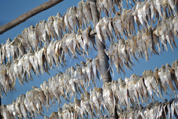 Chattogram, Bangladesh- Dry Fish process at an open drying yard in Chattogram, Bangladesh. The fish are cleaned, salted, and sun-dried on bamboo platforms for four to seven days, depending on weather conditions. Dry fish processing requires consistent heat and remains a vital food source in Bangladesh, accounting for the fourth-largest share of fish consumption and providing an affordable protein across all income levels. The dried fish are distributed for domestic use and export., Credit:Md Rafayat Haque Khan / Avalon