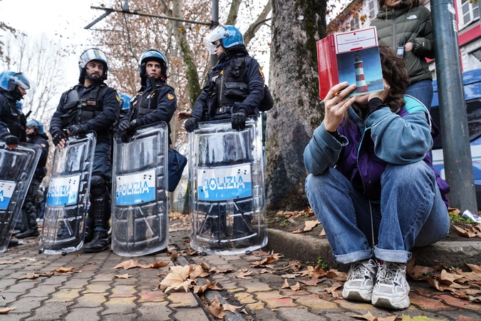 December 18, 2025, Turin, Corso Regina 47. The Askatasuna social center was searched and cleared. Pictured is a protester reading a few steps from the police cordon., Credit:Selene Daniele / Avalon