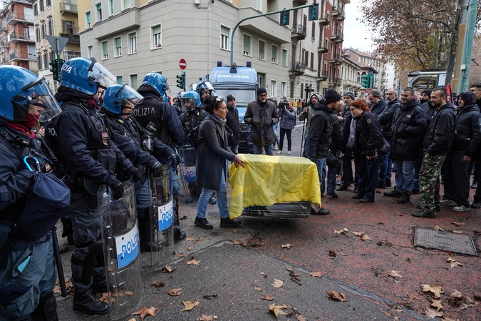 December 18, 2025, Turin, Corso Regina 47. Search and eviction of the Askatasuna social center. In the photo, protesters remove a cat from the social center., Credit:Selene Daniele / Avalon