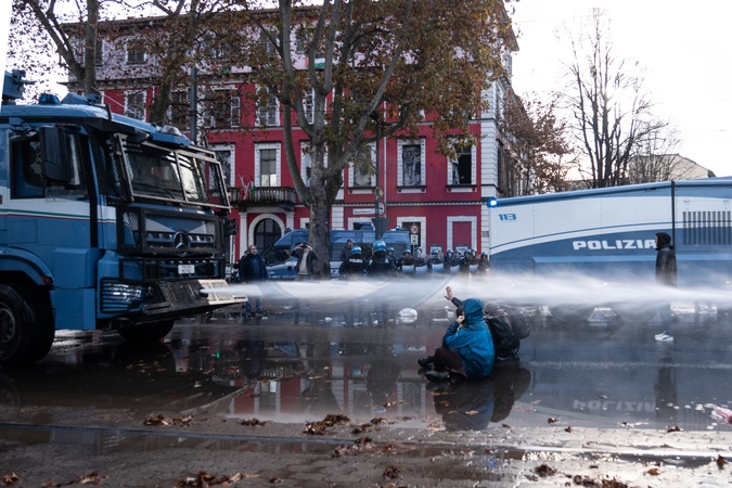 December 18, 2025, Turin, Corso Regina 47. The Askatasuna social center was searched and cleared. In the photo, police deploy water cannons to clear Corso Regina and contain the protesters., Credit:Selene Daniele / Avalon