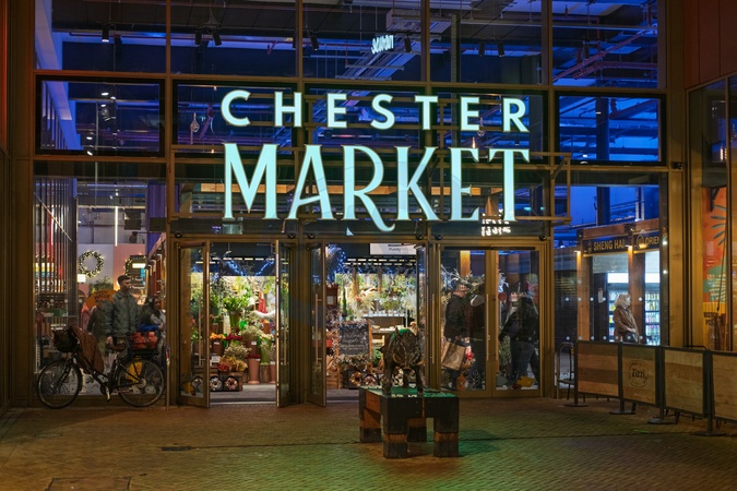 Chester market at Christmas time. Chester, Cheshire, North west England.