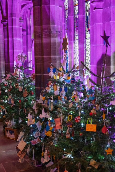 Christmas trees on display within Chester cathedral at Christmas time. Chester, Cheshire, North west England.