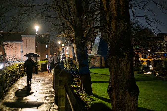 Walks along the Roman walls of Chester at Christmas time. Chester, Cheshire, North west England.