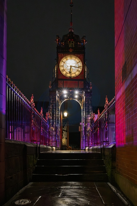 Eastgate clock in Chester at Christmas time. Chester, Cheshire, North west England.
