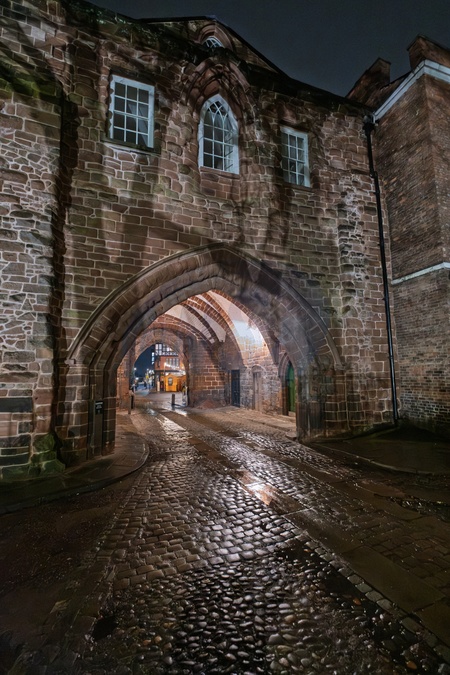 Archway from Abbey square leading to the market from the cathedral. Originally built in the 1300's and further building in the 1800's.Chester, Cheshire, North west England. . United Kingdom. 16 December 2025, Credit:Mark Fairhurst / Avalon