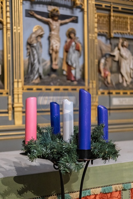 Advent candles by alter within Chester cathedral at Christmas time. Chester, Cheshire, North west England.