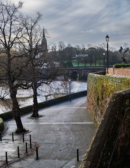 Looking across the River Dee from the walls. Chester, Cheshire, North west England.