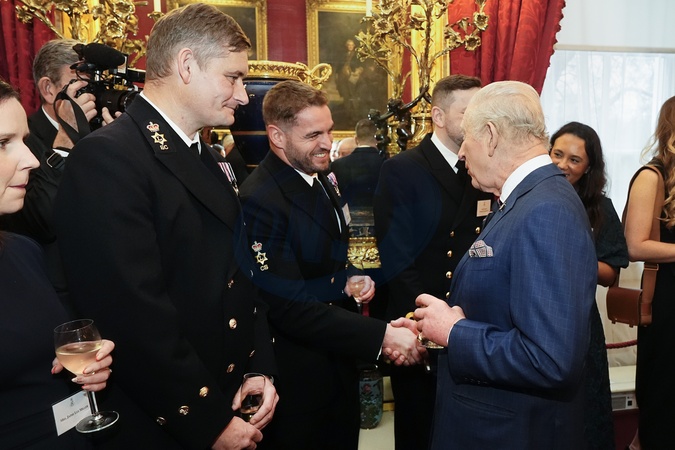 King Charles III (right) during a reception at St James's Palace in London, to celebrate the return of HMS Prince of Wales from an eight-month deployment with the Carrier Strike Group (CSG25), known as Operation Highmast. Picture date: Thursday December 18, 2025., Credit:Aaron Chown / Avalon